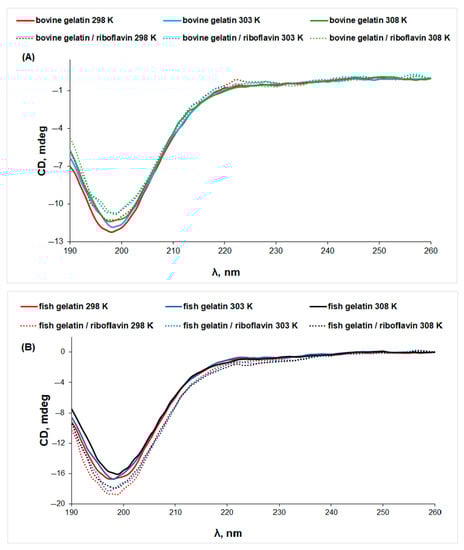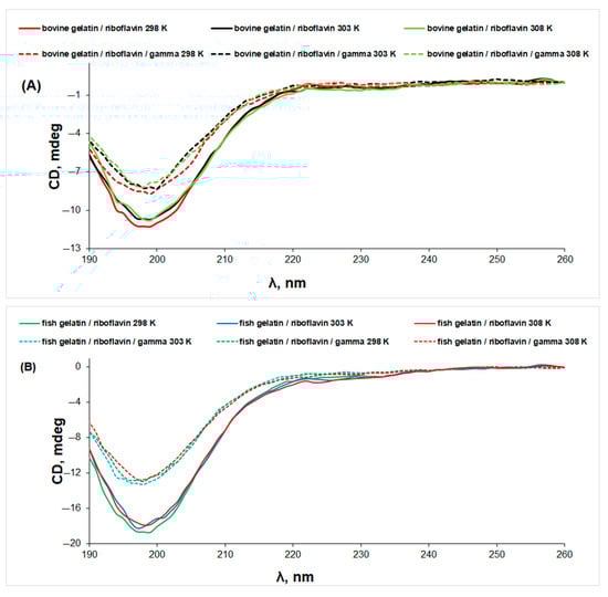 Exposure to gamma radiation generates a further denaturation of gelatin/riboflavin samples, without changing the shape of the CD spectra (Figure 7). The same effect is observed for the collagen/riboflavin solution (Figure S4).