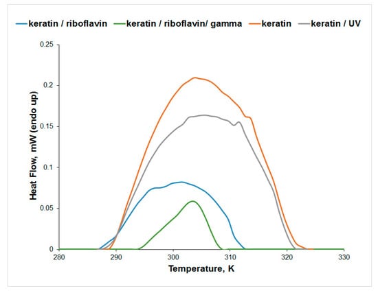 The μDSC measurements for the aqueous solution of keratin (Figure 8) indicate a higher thermal stability of keratin after UV irradiation, while the denaturation enthalpy change slightly decreases as a result of the conformational changes observed in the CD spectra. The presence of riboflavin decreases the thermal stability of keratin in water, while gamma irradiation increases the thermal stability of the keratin/riboflavin sample. Although the Tpeak value increases for the keratin/riboflavin gamma-irradiated sample, the denaturation enthalpy change is significantly reduced. This is a result of the keratin unfolding observed in the CD spectra, which causes the exposure of the hydrophobic domains to the aqueous solution.
