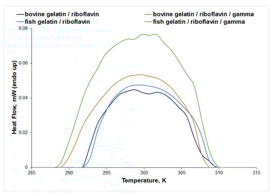 The influence of gamma irradiation on the thermal stability of gelatin/riboflavin samples in acetic acid 0.18 M is presented in Figure 9. The endothermic peak observed for gelatin corresponds to the helix-to-coil transition, as a result of the dissociation of the triple helices upon heating [40]. An increase in the thermal stability of the bovine gelatin/riboflavin sample was observed after irradiation, while no significant change was recorded in the μDSC profile of the fish gelatin/riboflavin sample. These results are in agreement with the IR data that showed no spectral changes for the fish gelatin/riboflavin sample as a result of irradiation.
