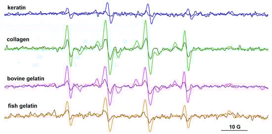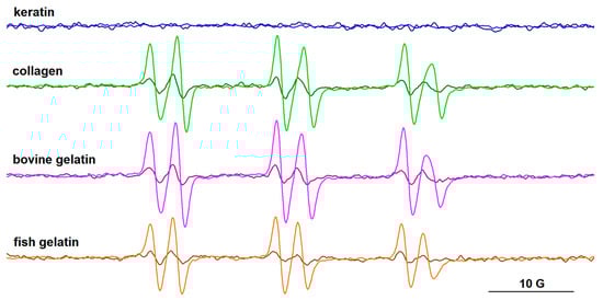 The EPR spectra of PBN adducts formed after gamma irradiation (10 kGy) in solutions of keratin, collagen, bovine gelatin, and fish gelatin, in the presence of riboflavin. Spectra recorded after 1 h (dark colors) and after 2 h (light colors) from irradiation.