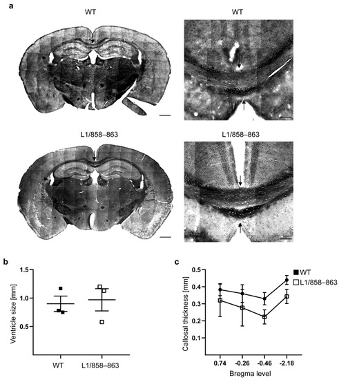 - Fransen, E.; D’Hooge, R.; Van Camp, G.; Verhoye, M.; Sijbers, J.; Reyniers, E.; Soriano, P.; Kamiguchi, H.; Willemsen, R.; Koekkoek, S.K.; et al. L1 knockout mice show dilated ventricles, vermis hypoplasia and impaired exploration patterns. Hum. Mol. Genet. 1998, 7, 999–1009. [Google Scholar] [CrossRef]