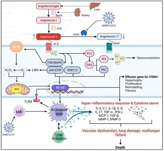 AngII/AT1R signaling pathways contribute to the immunopathological features of COVID-19. AngII is produced by the conversion of angiotensinogen from the liver into AngI by the release of renin from the kidney. AngI is metabolized by ACE into AngII, which can bind to the G-protein-coupled AT1R. The interaction of ACE2 with SARS-CoV-2 results in a loss of its functional expression and thus decreases its ability to metabolize AngII into the protective Ang (1–7). This interaction is marked by the excessive activation of AT1R signaling to promote tissue-dependent signal transduction pathways. In VSMCs, AngII/AT1R signaling results in the downstream formation of PLC, leading to the generation of DAG and activation of PKC and IP3. IP3 is then free to release Ca2+ into the cell cytosol, where it initiates vasoconstriction. Additionally, AngII/AT1R signaling can activate various protein kinase signaling pathways (p38-MAPK, JAK-STAT, ERK, and PKC), which are all involved in the pathogenic effects of AngII. This includes AngII-dependent oxidative stress through activation of NOX, resulting in the production of ROS, O2− and H2O2 that can damage cellular components, upregulate NF-κB to induce the production of pro-inflammatory cytokines, and disrupt endothelial function by decreasing the bioavailability of NO. AngII-dependent upregulation of NF-κB through kinase pathways can also directly induce immune cell activation, proliferation, and differentiation, as well as mediate the production of pro-inflammatory, pro-fibrotic, and pro-hypertrophic mediators. The NF-κB pathway is also involved in the pathogenesis of COVID-19 by inducing the production of pro-inflammatory mediators involved in the progression of the cytokine storm. The inflammatory response to SARS-CoV-2 is established via macrophage activation and TLR4 signaling to create an imbalance in the immune response and promote the excessive amplification of cytokine production that could be combined with the AngII/AT1R signaling cascade to result in the progression of endothelial dysfunction, lung injury, and multi-organ failure in severe and fatal states of COVID-19. Abbreviations: ACE, angiotensin converting enzyme; ACE2, angiotensin converting enzyme 2; AT1R, angiotensin type I receptor; AngI, angiotensin I; AngII, angiotensin II; Ang (1–7), angiotensin (1–7); Ca2+, calcium ions; COVID-19, coronavirus disease 2019; DAG, diacylglycerol; ERK, extracellular signal-regulated kinase; H2O2, hydrogen peroxide; IP3, inositol-1,4,5-triphosphate; IFN-γ, interferon-gamma; IL, interleukin; JAK-STAT, Janus kinases-STAT; MΦ, macrophage; MasR, Mas1 oncogene receptor; p38-MAPK, mitogen-activated protein kinases; MCP-1, monocyte chemoattractant protein-1; MMP, matrix metalloproteinase; NF-κB, nuclear factor kappa B; NO, nitric oxide; NOX, nicotinamide adenine dinucleotide phosphate oxidase; O2−, superoxide ion; PKC, protein kinase C; PLC, phospholipid-C; ROS, reactive oxygen species; SARS-CoV-2, severe acute respiratory syndrome coronavirus-2; T-cell, T-lymphocyte; TLR4, toll-like receptor 4; TGF-β, growth factor-beta 1; TNF-α: tumour necrosis factor-alpha; VSMCs: vascular smooth muscle cells. Figure created with biorender.com.