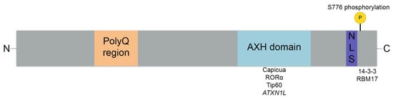 Ataxin-1 protein and its functional domains. The ataxin-1 protein with the polyglutamine (polyQ) region, the AXH domain, and the C-terminal domain containing the NLS and the S776 phosphorylation site. Binding partners of these domains are depicted under their respective domains.