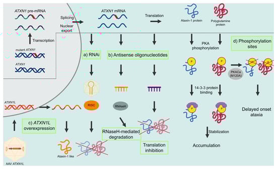 As discussed before, the cellular pathological mechanisms underlying SCA1 are driven mainly by the presence of the mutant ataxin-1 protein. Presently, many intervention strategies focus on the development of therapies that can reduce the levels of mutant ataxin-1, which will have an effect on all downstream pathological processes. The ataxin-1-lowering strategies that are currently in development target ATXN1 RNA act by either modulating RNA levels or by blocking translation. Here, we will provide an overview of the different ataxin-1 modulating therapies that are currently being explored for SCA1 (Figure 2).