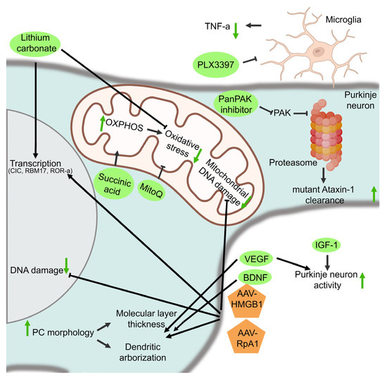 Other pharmacological targets for SCA1: These aim to restore PC survival and function, improve mitochondrial function, increase DNA damage repair, and enhance mutant ataxin-1 clearance by the proteasome or lower inflammation. Green arrows indicate the effect of the therapies on the different cell functions that are targeted.
