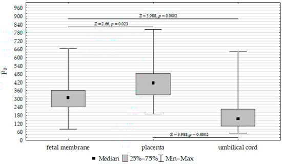 The concentrations of Fe, Zn, and Cu in the placenta, umbilical cord, and fetal membrane are presented in Table 4. The highest concentration of Fe (417.52 mg/kg−1 dw) was found in the placenta, while the lowest was found in the umbilical cord (200.17 mg/kg−1 dw). The zinc concentration was highest in the placenta (50.21 mg/kg−1 dw) and lowest in the fetal membrane (36.91 mg/kg−1 dw). In contrast, the highest concentration of Cu was found in the fetal membrane (7.31 mg/kg−1 dw), while the lowest was found in the placenta (4.47 mg/kg−1 dw). Accordingly, the Fe, Cu, and Zn concentrations differed significantly between the umbilical cord, placenta, and fetal membrane (Figure 1, Figure 2 and Figure 3).
