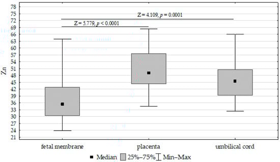 Kruskal–Wallis test results for differences between zinc (Zn) concentrations in the placenta, fetal membrane, and umbilical cord.