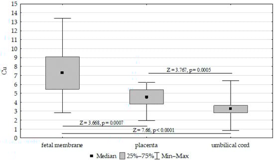Kruskal–Wallis test results for differences in cooper (Cu) concentrations between the placenta, fetal membrane, and umbilical cord.