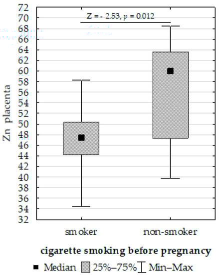 The present study showed differences in the placental concentrations of Zn between women who smoked and did not smoke before pregnancy. Kantola et al. [] observed that the Zn concentration in the placenta of women who smoked during pregnancy was 20% higher than that of non-smoking women in a study involving women with singleton pregnancies from various regions in Europe. In contrast, Kutlu et al. [] found that the concentration of Zn in the placenta of smoking women was lower than that of non-smoking women during pregnancy. These results suggest that changes in Zn concentration caused by nicotine may be due to the vasoconstriction of utero placental blood vessels, thereby disrupting the transport of nutrients, including macro- and micronutrients. Additionally, nicotine may contribute to the destruction of the epithelial fibers of the placenta responsible for the transport of these elements [].