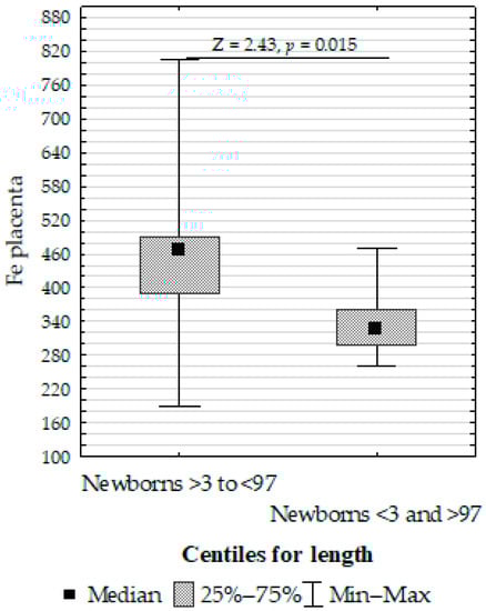 In the present study, it was found that the concentration of Fe in the placenta had an impact on its weight, as confirmed by the analyses of Hindmarsh et al. [] in women with singleton pregnancies. Godfrey et al. [] demonstrated that Fe deficiency is associated with a larger placental weight, which may have significant implications for the infant. Levario-Carrillo et al. [] confirmed a tendency for increased placental weight in women with iron deficiency anemia (IDA); however, there was no significant effect on the weight or growth of the newborn. On the other hand, other studies have shown that IDA during pregnancy can lead to low birth weight [,,].