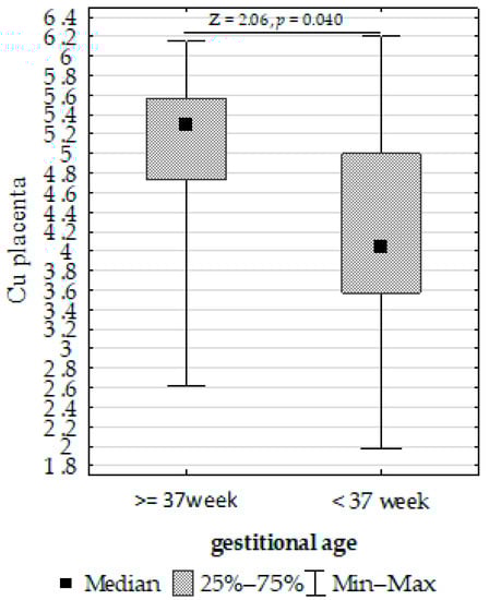 Mann–Whitney U test results for differences in placenta copper (Cu) depending on gestational age.
