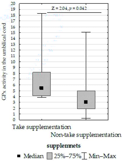 - Decreased umbilical cord GPx activity in women who did not take supplementation compared to those who did (Figure 7);