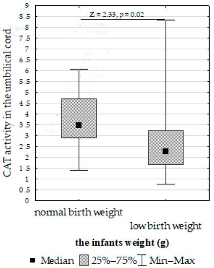 Mann–Whitney U test results for differences in catalase (CAT) activity between infants with normal and low birth weights.