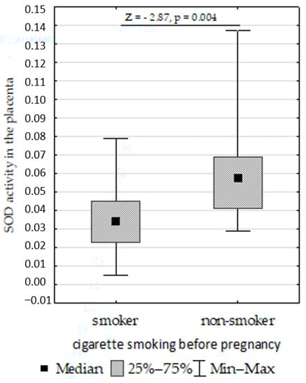 - Increased placenta SOD activity concentration in non-smoking women compared to those who smoked before pregnancy (Figure 9);