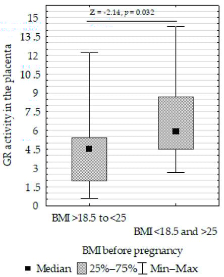- Decreased placenta GR activity in women with >18.5 to <25 BMI compared to women with <18.5 and >25 BMI (Figure 10).