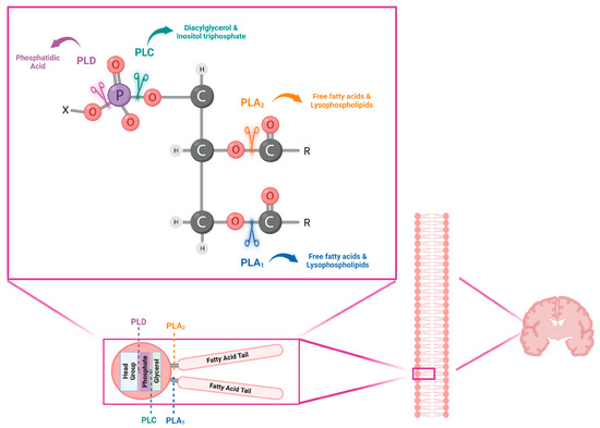 Phospholipases can be classified into four major classes according to the type of reaction that they catalyze [1,5]. Phospholipase A1 (PLA1), phospholipase A2 (PLA2), and phospholipase B (PLB) represent acylhydrolases, being able to preferentially cleave the acyl ester bond at the sn-1 acyl chain, the sn-2 acyl chain, and both the positions of PLs, respectively, whereas phospholipase C (PLC) and phospholipase D (PLD) constitute phosphodiesterases [7]. In particular, PLCs are responsible for hydrolyzing phosphatidylinositol 4,5-bisphosphate (PtdIns(4,5)P2) to generate the two essential intracellular second-messenger diacylglycerol (DAG) and inositol 1,4,5-trisphosphate (IP3) [8], leading to the activation of protein kinase C (PKCs) and the release of calcium ions (Ca2+) from intracellular stores, respectively [9]. On the other hand, PLDs hydrolyze the distal phosphodiester bond of PLs, releasing phosphatidic acid (PA) and the corresponding head-group [7]. According to the Human Protein Atlas (www.proteinatlas.org, accessed on 1 April 2023), phospholipase B (PLB) expression is limited prevalently to the distal intestine [10], and it is represented by low human brain regional specificity. For this reason, this review is focused on the other three phospholipases, which are abundant in the human brain [1].
