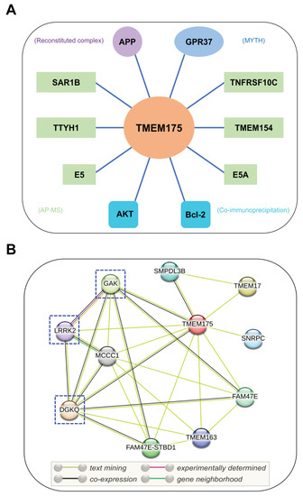 Interacting partners of TMEM175. (A) Potential binding partners of TMEM175. The experimental methods used to identify these TMEM175-protein interactions are shown in brackets. GPR37, G-protein-coupled receptor 37; APP, amyloid-beta precursor protein; E5 and E5A, viral proteins of human papillomavirus; SAR1B, secretion-associated Ras-related GTPase 1B; TMEM154, transmembrane protein 154; TNFRSF10C, tumor necrosis factor receptor superfamily member 10c; TTYH1, Tweety Homolog 1. MYTH, modified membrane yeast two-hybrid; AP-MS, affinity purification mass spectrometry. (B) STRING analysis of TMEM175-protein interaction networks. DGKQ, diacylglycerol kinase theta; FAM47E, family with sequence similarity 47 member E; GAK, cyclin G-associated kinase; LRRK2, leucine-rich repeat kinase 2; MCCC1, methylcrotonoyl-CoA carboxylase subunit alpha; SMPDL3B, acid sphingomyelinase-like phosphodiesterase 3b; SNRPC, U1 small nuclear ribonucleoprotein C; FAM47E-STBD1, FAM47E-STBD1 readthrough; TMEM17, transmembrane protein 17; and TMEM163, transmembrane protein 163. The PD-related binding partners of TMEM175 are highlighted by dashed boxes.