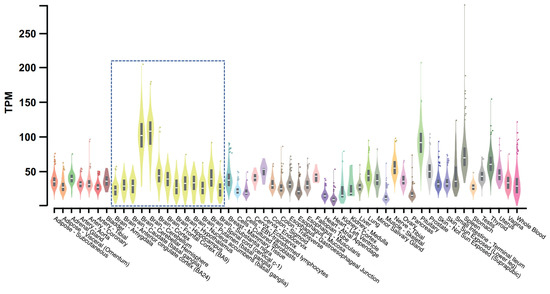Bulk tissue gene expression for TMEM175. This figure is processed from the GTEx portal (https://www.gtexportal.org (accessed on 1 December 2022)) [89]. Data source: GTEx Analysis Release V8 (dbGaP Accession phs000424.v8.p2). The gene expression level is shown in TPM (transcripts per million kilobases), calculated from a gene model with isoforms collapsed to a single gene. The gene expression level in different tissues is indicated by different colors with yellow violin plots (boxed) showing expression levels in brain tissues.