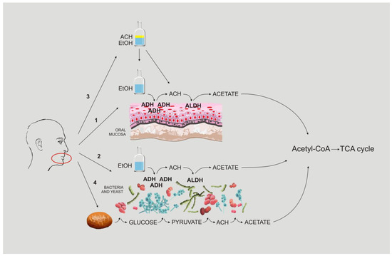 Typically, measurable amounts of ACH are not found in human saliva [112]. However, ethanol consumption (or tobacco smoking) causes an accumulation of ACH in the saliva which is dependent on the concentration, in seconds, that persists from 10 to 15 min following every sip of an alcoholic drink. Both ADH and ALDH dehydrogenases are expressed in the oral mucosa; however, ALDH is less active than ADH. Therefore, transformation into the relatively non-harmful acetate molecule is minimal in the oral cavity. This may lead to the build-up of mutagenic concentrations of ACH in saliva (compared to blood, its levels are 10 to 100 times higher) [113,114]. The locally generated ACH is mainly produced by microbes representing the normal gastrointestinal flora [9,115]. Bacteria and yeast in the mouth (e.g., Candida albicans and other Candida species) acquire ethanol from alcoholic and “non-alcoholic” drinks and foods to produce ACH. According to our findings, they also can convert sugars to ACH from food and drinks that do not contain alcohol at all [35]. It should be repeated that the ability of the mouth microbiota to eradicate ACH is equally low.