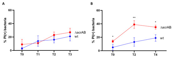 To test the response to the host cell environment in the absence of AcrAB, both THP-1- derived macrophages and Caco-2 epithelial cells were infected with the wild-type M90T strain and the ΔacrAB derivative. We first assessed Shigella intracellular survival via DAPI/PI double staining of bacteria harvested from infected cells at different time points post-infection (p.i.). Figure 2A shows that lack of AcrAB EP poorly affects the viability of M90T when inside macrophage environment as, by and large, the proportion of dead bacteria detected at each time point was very similar either for the wild-type or mutant strain. Conversely, the absence of AcrAB is detrimental to M90T infecting epithelial cells. Indeed, as shown in Figure 2B, while a certain fraction of dead wild-type bacteria was observed to constantly increase throughout the infection period analyzed, a high amount of PI-positive M90T ΔacrAB was found already at a very early stage of infection (T0) of Caco-2 cells. This proportion further increases at two hours p.i., keeping higher than that of the parental strain till the last time point analyzed.