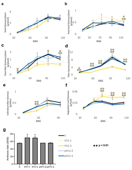 Rice plants constitutively expressing HaHB11 partition more biomass to leaves than to tillers and exhibit delayed anthesis. (a) Total biomass per plant. (b) Total leaf biomass per plant. (c) Total tiller biomass per plant. (d) Total tiller biomass/total leaf biomass ratio. (e) Individual tiller biomass. (f) Individual vegetative leaf biomass expressed in g/leaf. (g) Anthesis day. Assays were repeated during four campaigns with N: 18–24/genotype. Wild-type Kitaake plants were used as controls (C) and are graphed in black color, whereas H11 and pH11 plants are represented in yellow and blue, respectively. The figure illustrates the data obtained in one of these campaigns, that of summer 2021–2022. The whole data of the five campaigns can be visualized in Table S3. Error bars represent SEM. Asterisks indicate significant differences (* p < 0.05, ** p < 0.01).