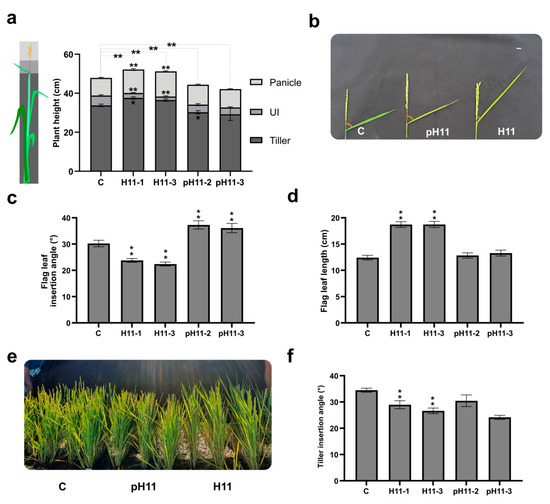 H11 plants exhibit a differential architecture impacting seed yield. (a) Plant height on day 93 after sowing, indicating the contribution of the tiller, the uppermost internode, and the panicle length. (b) Picture illustrating the differences between genotypes in uppermost internodes and flag leaf angles of 93-day-old plants; measured angles are shown in red. (c) Angle formed between the uppermost internode and the flag leaf seven days after flowering. (d) Flag leaf length in 97-day-old plants. (e) Illustrative picture of control, pH11, and H11 93-day-old plants. (f) Tiller angles assessed 30 days after sowing. Assays were repeated at least three times with N: 18–24/genotype. The figure illustrates the data obtained in one of these campaigns, that of summer 2021–2022. The whole data of the five campaigns can be visualized in Table S3. Error bars represent SEM. Asterisks indicate significant differences (* p < 0.05, ** p < 0.01).