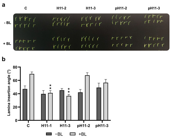 H11 flag leaf angles are insensitive to brassinosteroids. (a) Illustrative picture of detached leaf section including lamina joint of control (C), H11 (two independent lines, H11-2 and H11-3), and pH11 (two independent lines, pH11-2 and pH11-3) plants before (upper panel) and after (lower panel) brassinolide treatment; the scale bar represents 1 cm. (b) Angle of the lamina joint. The assays were repeated at least twice with N: 10–12/genotype. Error bars represent SEM. Asterisks indicate significant differences (** p < 0.01).