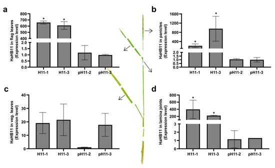The localized expression of the sunflower HaHB11 gene is necessary to confer the differential traits. (a) HaHB11 transcript levels evaluated with RT-qPCR in 93-day-old H11 (two independent lines, H11-2 and H11-3) and pH11 (two independent lines, pH11-2 and pH11-3) flag leaves; the same panicles (b), vegetative leaves (c), and lamina joint (d). All the values were normalized to those obtained in pH11-2 plants, which were arbitrarily assigned a value of 1 (one). N: 3/genotype. Error bars represent SEM. Asterisks indicate significant differences (* p < 0.05).