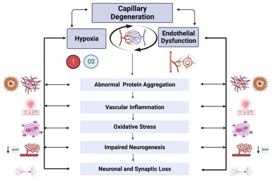 Angiogenesis and vascular remodeling are impaired in AD as evidenced by altered expression profiles of several angiogenic factors, such as VEGF, vascular-restricted mesenchyme homeobox-2 (MEOX2), MMP-9, angiopoietin-2, integrins (αvβ3 and αvβ5), and the transferrin receptor, leading to vascular regression and abnormal vessel sprouting [,]. Several inflammatory mediators (e.g., IL-1β) stimulate angiogenesis through pathways that overlap with hypoxia signaling, suggesting important links between hypoxia, inflammation, and angiogenesis in AD [].
