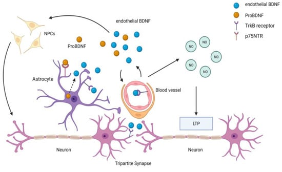Proposed mechanisms by which endothelial BDNF promotes neuroplasticity include direct binding to neuronal tyrosine receptor kinase B (TrKB) receptors or sustained activation of endothelial TrKB receptors, which results in increased NO production and induces long-term potentiation, an essential process for memory and learning [,]. The latter suggests a direct link between endothelial dysfunction and cognitive impairment. Further, some of the effects of endothelial BDNF on neurons may be mediated by astrocytes at tripartite synapses. Astrocytes express the p75 neurotrophin receptor (p75NTR), which binds with high affinity to the BDNF precursor, proBDNF, leading to the internalization of this complex into astrocytes and the maturation of proBDNF into mature BDNF, which is then released into the neuronal milieu [,]. Therefore, endothelial BDNF can modulate synaptic plasticity through astrocyte-dependent or astrocyte-independent pathways (Figure 3).
