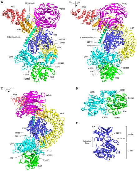 (A–C) Three-dimensional structure of full-length LRRK2 (PDB: 7LHW) solved by cryo-EM at a resolution of 3.1 Å. The color of each domain was made according to the scheme shown in Figure 1A. Note that the structure of the amino-terminal 557 residues was flexible and not solved in this structure. The 3D structures in (B,C) are 45° and 90° rotations of the 3D structure in (A), respectively. (D,E) Close-up of the ROC-COR domain interface (D) and kinase domain (E). The mutated residues are indicated by a ball-and-stick representation. The structural representations were displayed using CueMol2 (http://www.cuemol.org; last access date: 14 May 2023).