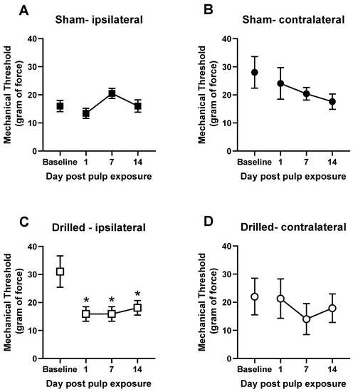 Exposure of the tooth pulp in the left mandibular molar of rats produces ipsilateral orofacial allodynia for up to 2 weeks. Effect of sham procedure or pulp exposure on mechanical withdrawal threshold on the ipsilateral side (A,C) or contralateral side (B,D). Orofacial sensitivity was measured with Von Frey filaments prior to pulp exposure procedure and again 1, 7, and 14 days post-exposure. N = 10/group. Ipsilateral and contralateral data are collected from the same rats. * p < 0.05 compared with baseline.