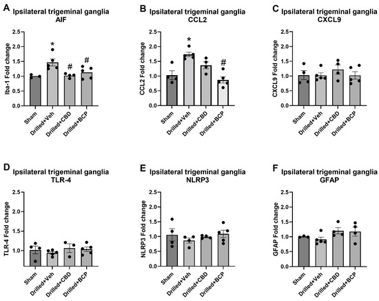 The effects of pulp exposure and cannabinoid treatment on the expression of markers of inflammation were also statistically analyzed using one-way ANOVA. The examination of the expression of AIF, the gene that encodes the macrophage/microglial marker Iba-1, in trigeminal ganglia on the ipsilateral drilled side revealed a significant effect of treatment [F(3,14) = 5.995] (Figure 3A). Dunnett’s multiple comparison test showed that pulp exposure (drilled + veh) produced a significant increase in AIF expression compared with sham treatment (p < 0.05). Additionally, treatment with either β-CP or CBD significantly downregulated AIF expression in the trigeminal ganglia of the ipsilateral drilled molar side. The examination of the expression of CCL2 (MCP-1, a neuroimmune chemokine implicated in nociception) in the trigeminal ganglia on the ipsilateral drilled side also revealed a significant effect of treatment [F(3,14) = 12.71] (Figure 3B). Dunnett’s multiple comparison test showed that pulp exposure (drilled + veh) produced a significant increase in CCL2 expression compared with sham treatment (p < 0.05). β-CP (30 mg/kg) treatment significantly downregulated CCL2 expression compared with the vehicle-treated drilled group. There was a non-significant trend for CBD to also decrease CCL2 expression (p = 0.09). This model of pulpitis did not produce any significant changes in the ipsilateral trigeminal ganglia in the expression of TLR-4, CXCL9, NLRP3, or GFAP (Figure 3C–F).