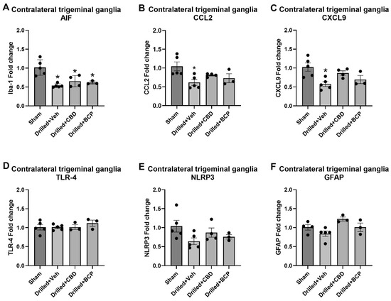 The examination of the expression of AIF in the contralateral trigeminal ganglia also revealed a significant effect of treatment [F(3,13) = 11.45] (Figure 4A). Dunnett’s multiple comparison test showed that pulp exposure produced a significant decrease in AIF expression in vehicle, CBD-, and β-CP-treated groups compared with sham treatment (p < 0.05). The examination of the expression of CCL2 in the trigeminal ganglia on the ipsilateral drilled side also revealed a significant effect of treatment [F(3,13) = 4.359] (Figure 3B). Dunnett’s multiple comparison test showed that pulp exposure (drilled + veh) produced a significant increase in CCL2 expression compared with sham treatment (p < 0.05). There was also a significant effect of treatment in the contralateral trigeminal ganglia on the expression of CXCL9, a proinflammatory chemokine produced by macrophages and glial cells that has been associated with inflammation in the dorsal root ganglia (DRG) [F(3,13) = 5.536], shown in Figure 4C. Dunnett’s multiple comparison test showed that pulp exposure (drilled + veh) produced a significant decrease in CXCL9 expression in the contralateral trigeminal ganglia (p < 0.05). No significant changes in the contralateral trigeminal ganglia in the expression of TLR-4, NLRP3, or GFAP were observed (Figure 4D–F).