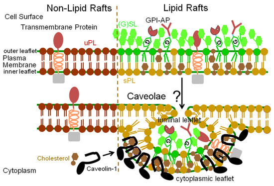 Localization of GPI-APs and their endocytosis (via caveolae) at lipid rafts, which are made up of (glyco)sphingolipids (GSL) at the outer leaflet of the PM bilayer, caveolin-1, phospholipids with saturated fatty acyl chains (sPL), and cholesterol at the inner leaflet. In contrast, non-lipid rafts predominantly contain transmembrane proteins and phospholipids with unsaturated fatty acyl chains (uPL). Lipid rafts are thought to act as nucleation sites for the biogenesis of caveolae upon invagination of the PMs into the cell interior. Following incision and fusion, the formed membrane vesicles would harbor the typical components of lipid rafts, among them cholesterol in concert with caveolin-1 (enriched at the cytoplasmic leaflet of the membrane bilayer), glycosphingolipids (enriched at the luminal leaflet) and GPI-APs. Their GPI anchor may become inserted in the luminal leaflet of the membrane bilayer and their protein moieties located in the vesicle lumen. Not only endocytosis, but also transcytosis of GPI-APs may involve caveolae. Experimental data supporting this view are currently intensively disputed (for a review, see [121,122]).