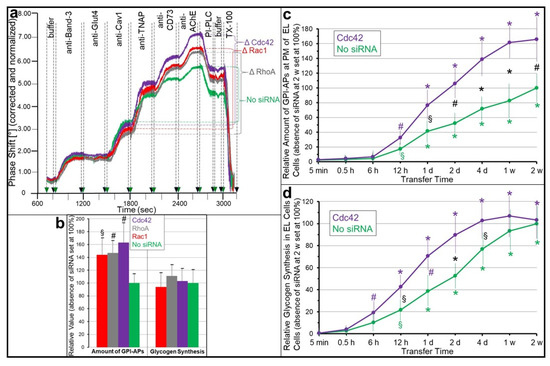 Inhibition of internalization of GPI-APs during transfer from human adipocytes and stimulation of glycogen synthesis in the ELCs. Transwell co-cultures were run (37 °C, absence of serum and BSA, (a,b), 2 weeks; (c,d), transfer times as indicated) with human donor adipocytes (of lipid-loading stage IV) and GPI-deficient acceptor ELCs in the insert and bottom wells, respectively, in the absence (a–d, No siRNA) or presence of siRNAs (30 nM) directed against Cdc42 (a–d), Rac1 (a,b) or RhoA (a,b). Subsequently, PMs were prepared from the ELCs of the bottom wells, then coupled to chips by ionic/covalent capture and finally analyzed for the expression of membrane proteins by SAW biosensing. (a) Phase shifts Δ in response to injection of anti-TNAP, anti-CD73 and anti-AChE antibodies (1800 to 2700 sec) were measured as summation signals and are indicated by horizontal hatched lines and brackets for each incubation. (b–d) The experiment was repeated three to four times (different transwell co-cultures). Relative amounts of total transferred GPI-APs at PMs of ELCs (summation signals) (b,c) as well as relative glycogen synthesis (0.1 mM glucose) (b,d) in the absence (set at 100%) or presence of the siRNAs are given. Significant differences between the presence and absence of siRNAs at identical transfer times (b–d, black symbols) as well as between the various transfer times and the 5-min times for presence and absence of Cdc42 siRNA each (c,d, turquoise and green symbols, respectively) are indicated (means ± S.D.; * p ≤ 0.01, # p ≤ 0.02, § p ≤ 0.05).