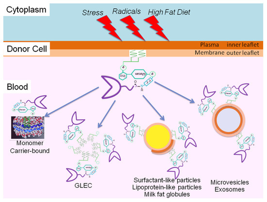 (v) Those full-length GPI-APs are detected in extracellular aqueous compartments, such as body fluids or culture media, embedded into membranous structures, such as vesicles and lipoprotein-like particles (LLPs), or assembled into lipid-containing micelle-like complexes and lipid-free multimers or associated with GPI-binding proteins (for a review, see [346]).