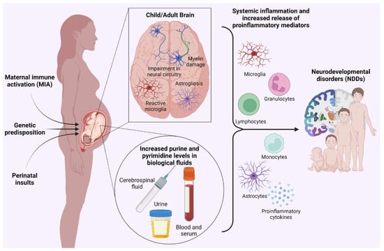 During pregnancy, perinatal insults and maternal immune activation (MIA), together with genetic predisposition, may compromise the physiological development of fetal brains’ cytoarchitecture, which is then mirrored by impairments in the formation of neural circuitries, astrogliosis, microglia shifting from a homeostatic to a reactive state and myelin damage in the brain of affected subjects during postnatal life. These pathological alterations have also been reported to be paralleled by changes in the purine and pyrimidine metabolites profile, as detected in human biofluids of children affected by neurodevelopmental disorders (NDDs). Epidemiological studies support the theory that a state of systemic inflammation and the substantial release of proinflammatory mediators may be related to the increased levels of purines detected in patients suffering from NDDs, which may act as damage-associated molecular patterns (DAMPs) and, thereby, potentially lead to defects in the physiological development of the central nervous system (CNS).