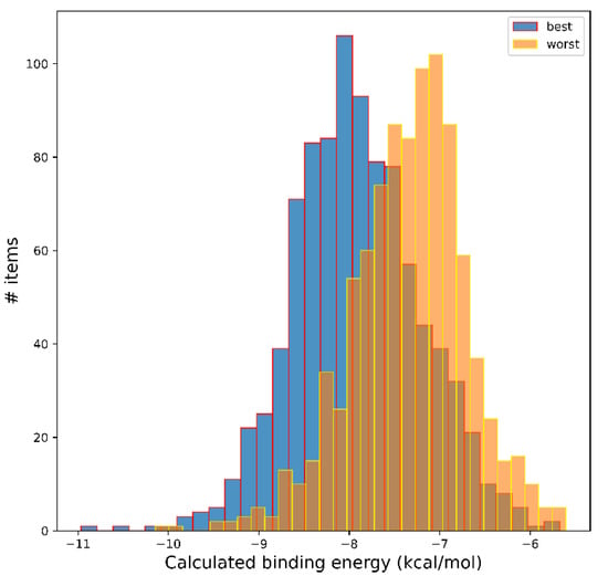 Keeping what has been reported above in mind, we evaluated the validity our AI system predictions by considering how the predicted best (and worst) ligands performed in a completely different computational setup, namely molecular docking. We selected as best predicted ligands those with calculated pChEMBL values ≥ 10.0, and as worst predicted ligands, an equal number of molecules with the lowest predicted pChEMBL value (each of the two data sets containing 933 elements). These molecules were subjected to molecular docking on an HIV-1 protease template by means of AutoDock Vina, as detailed in Materials and Methods. The results of this analysis are shown in Figure 2, which reports the distribution of the calculated binding energies (BEs).