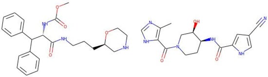 Molecules with known activity on the HIV-1 protease were obtained from ChEMBL [,,] (query target CHEMBL243). The data set was analyzed with pandas [,] for the presence of duplicates, which were eliminated, and in this case, the one with the best inhibition value was kept.