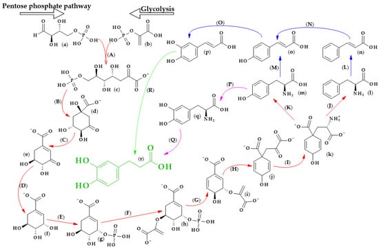 Dihydrocaffeic acid biosynthesis—proposed simplified pathway (adapted and modified from [34,35,36,37,38,39]). Explanations: (a)–(r)—compounds, A–R—enzymes, i.e., (a)—D-Erythrose 4-phosphate, (b)—Phosphoenolpyruvate, (c)—7-phospho-2-dehydro-3-deoxy-D-arabino-heptonate, (d)—3-Dehydroquinate, (e)—3-Dehydroshikimate, (f)—Shikimate, (g)—Shikimate-3-phosphate, (h)—5-O-(1-carboxyvinyl)-3-phosphoshikimate, (i)—Chorismate, (j)—Prephenate, (k)—L-Arogenate, (l)—Phenylalanine, (m)—Tyrosine, (n)—trans-Cinnamic acid, (o)—p-Coumaric acid, (p)—Caffeic acid, (q)—3,4-Dihydroxy-L-phenylalanine (L-Dopa), (r)—Dihydrocaffeic acid, (A)—3-deoxy-7-phosphoheptulonate synthase (EC 2.5.1.54), (B)—3-dehydroquinate synthase (EC 4.2.3.4), (C)—3-dehydroquinate dehydratase I (EC 4.2.1.10), (D)—shikimate dehydrogenase (EC 1.1.1.25), (E)—shikimate kinase (EC 2.7.1.71), (F)—3-phosphoshikimate 1-carboxyvinyltransferase (EC 2.5.1.19), (G)—chorismate synthase (EC 4.2.3.5), (H)—chorismate mutase (EC 5.4.99.5), (I)—bifunctional aspartate aminotransferase and glutamate/aspartate-prephenate aminotransferase (EC 2.6.1.1, EC 2.6.1.78, EC 2.6.1.79), (J)—arogenate/prephenate dehydratase (EC 4.2.1.91, EC 4.2.1.51), (K)—arogenate dehydrogenase (NADP+) (EC 1.3.1.78), (L)—phenylalanine ammonia-lyase (EC 4.3.1.24), (M)—phenylalanine/tyrosine ammonia-lyase (EC 4.3.1.25), (N)—trans-cinnamate 4-monooxygenase (EC 1.14.14.91), (O)—p-coumarate 3-hydroxylase (EC 1.14.13.-), (P)—tyrosine 3-monooxygenase (EC 1.14.16.2), (Q)—3,4-dihydroxy-L-phenylalanine ammonia-lyase (EC 4.3.1.22), and (R)—double bond reductase (EC 1.3.1.-).