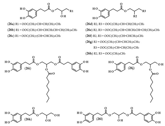 Chemical structures of phenolipids with dihydrocaffeic moiety/moieties. Chemical structures of: 1-dihydrocaffeoyl-3-oleoylglycerol (26a), 1-dihydrocaffeoyl-3-linoleoylglycerol (26b), 1-dihydrocaffeoyl-3-linolenoylglycerol (26c), 1-dihydrocaffeoyl-2,3-dioleoylglycerol (26d), 1-dihydrocaffeoyl-2,3-dilinoleoylglycerol (26e), 1-dihydrocaffeoyl-2,3-dilinolenoylglycerol (26f), 1-dihydrocaffeoyl-2-linolenoyl-3-oleoylglycerol (26g), 1-dihydrocaffeoyl-2,3-dicapryloylglycerol (26h), 1,3-bis(dihydrocaffeoyl)-2-capryloylglycerol (26i), 1-dihydrocaffeoyl-2-capryloylglycerol (26j), dihydrocaffeoylglycerol (26k), and 1,3-bis(dihydrocaffeoyl)glycerol (26l).