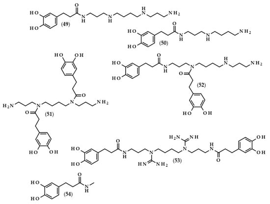 Kukoamines are another group of dihydrocaffeic acid derivatives. Chemically, they are amides of dihydrocaffeic acid and spermine or spermidine, organic chemical compounds belonging to polyamines. The sources of kukoamines are primarily nightshade plants (Solanaceae); as well, the presence of kukoamine A (N1,N12-bis(dihydrocaffeoyl)spermine, 8) was confirmed in the stems of Enoki mushrooms (Flammulina velutipes) [27,28,29,30,31]. The Kukoamine A structure was revealed in 1980 by Funayama et al. [27], and this amide was found in the root barks of Lycium chinense, a well-known oriental medicine called “jikoppi” which has hypotensive, hypoglycemic, and antipyretic activities. A combination of spectroscopic methods and acid hydrolysis afforded the finding of another structure of such amides, kukoamine B (N1,N8-bis(dihydrocaffeoyl)spermine, 9). Extraction and chromatography allowed for the isolation of 120.7 mg of kukoamine B from 10 kg of the dried root bark of L. chinense [28]. Studies on dihydrocaffeoyl polyamines in nightshade plants have also been conducted by Parr et al. [29]. The presence of kukoamines was confirmed in the tubers of 24 different potato varieties. Interestingly, the authors, besides kukoamine A, also described other polyamines, both with spermine and spermidine, with double or triple amide combinations of dihydrocaffeic acid. These were the following chemical compounds: N1,N8-bis(dihydrocaffeoyl)spermidine (10), N1,N4,N12-tris(dihydrocaffeoyl)spermine (11), and N1,N4,N8-tris(dihydrocaffeoyl)spermidine (12), and their contents in potato tubers were dependent on the varieties. Furthermore, in the other nightshade species, kukoamines were also present, i.e., in the leaf extract of Nicotiana sylvestris (probably compounds 8 and 10), as well as in tomato (Lycopersicon esculentum)—low levels of 8, 10, and 11 [29]. Forero et al. [31] identified four compounds that are responsible for the bitterness of Lulo (S. quitoense) fruits, especially the bitterness that increased during fruit pulp juicing and drying. Two of them were representatives of kukoamine derivatives, namely N1,N8-bis(dihydrocaffeoyl)spermidine (10) and N1,N4,N8-tris(dihydrocaffeoyl)spermidine (12), where the concentration of the latter was approximately 25 mg/kg of fruit pulp [31].
