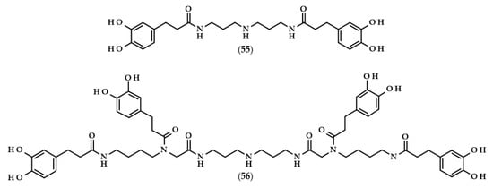 Completely different derivatives were developed and tested by Benfeito et al. [105]. Dozens of synthesized compounds consisted of a carboxamide with a phenolic ring, 6- or 10-carbon chain alkyl linker, and triphenylphosphonium moiety, which is a well-known mitochondrial targeting vector. Some of the compounds had dihydrocaffeoyl moiety, namely, (6-(3-(3,4-dihydroxyphenyl)propanamide)hexyl)triphenylphosphonium methanesulfonate (44a) and (10-(3-(3,4-dihydroxyphenyl)propanamide)decyl)triphenylphosphonium methanesulfonate (44b) (Figure 10).