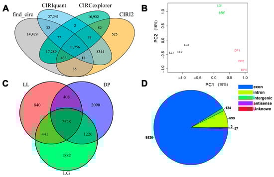 Identification and classification of circRNAs. (A) Number of circRNAs identified by four software; (B) Principal component analysis of mammary gland tissue samples; (C) Venn diagram of circRNA expression at different developmental stages; (D) Classification of circRNAs. LL: late lactation; DP: dry period; and LG: late gestation.