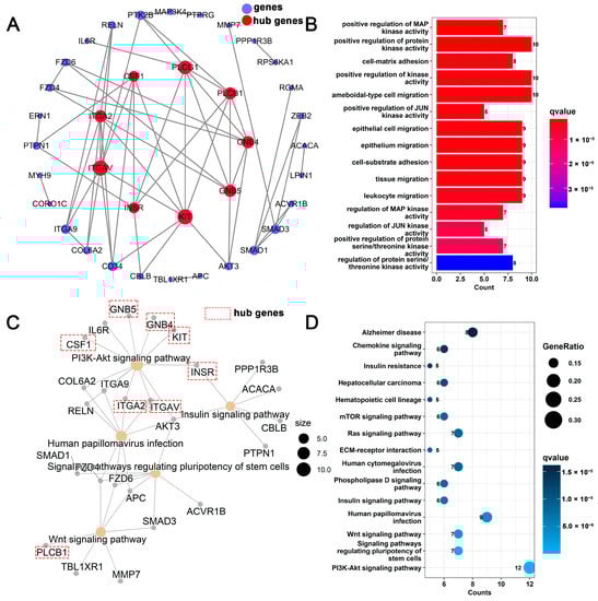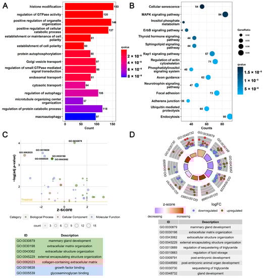 Analysis of circRNA–miRNA–mRNA ceRNA regulatory network related to mammary gland development. (A) PPI network analysis of mammary-gland-development-related genes; (B) GO analysis of mammary-gland-development-related genes; (C) Relationship between KEGG pathways and genes; (D) KEGG analysis of mammary-gland-development-related genes.