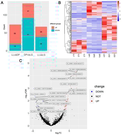 Differential expression analysis of circRNAs in different mammary-gland-developmental stages. (A) Number of up-regulated and down-regulated circRNAs; (B) A heatmap of differentially expressed circRNA expression; (C) Volcano map of differentially expressed circRNAs in LL vs. DP. LL: late lactation; DP: dry period; and LG: late gestation.