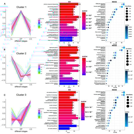 A total of 23,574 target regulatory relationships were predicted between 330 miRNAs and 218 differentially expressed circRNAs by miRanda software. There were 441,782 targeted regulatory relationships between miRNAs and 12,056 protein-coding transcripts (Table S6). Through cluster analysis of circRNA expression, circRNAs were clustered into three clusters (Figure 4 and Table S7). The first cluster contained 58 circRNAs, which were highly expressed in the DP. The corresponding functional analysis results of miRNA target genes (Figure 4A) showed that GO terms, such as cellular component disassembly, cell–substrate adhesion, and extracellular matrix organization, were significantly enriched (FDR < 0.05). The KEGG pathway analysis results showed that the PI3K-Akt signaling pathway, thyroid hormone signaling pathway, and focal adhesion were significantly enriched (FDR < 0.05). In addition, signaling pathways related to immunity and diseases (human papillomavirus infection, non-small-cell lung cancer, chemokine signaling pathway, etc.) were also significantly enriched during the DP. The second cluster contained 54 circRNAs that were highly expressed during LL (Figure 4B). GO results showed that dephosphorylation, positive regulation of cellular catalytic process, cell growth, extrinsic apoptotic signaling pathway, and other GO terms are significantly enriched (FDR < 0.05). KEGG pathway results showed that the PI3K-Akt signaling pathway, ErbB signaling pathway, mTOR signaling pathway, apoptosis, and other pathways related to cell growth were significantly enriched. The largest number of circRNAs in cluster 3 was 106 circRNAs, which were highly expressed in LG (Figure 4C). Cell–substrate adhesion, regulation of autophagy, nucleocytoplasmic transport, Golgi vesicle transport, dephosphorylation, histone modification, the prolactin signaling pathway, the insulin signaling pathway, and other terms were significantly enriched (FDR < 0.05). In summary, circRNAs can affect physiological processes, such as apoptosis, growth, substance metabolism, tissue remodeling, intercellular adhesion, intercellular connection and communication, disease infection, and immune response, by competitively binding with miRNAs.