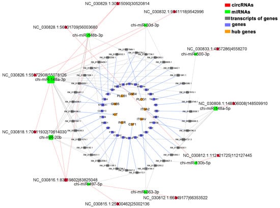 A total of 22 genes related to mammary gland immunity were screened, 7 of which were identified as hub genes of the PPI network (Figure S16A). These genes are enriched in mononuclear cell differentiation, lymphocyte differentiation, cell activation involved in immune response, B cell activation, and other physiological processes. KEGG results showed (Figure S16C) that the B-cell-receptor signaling pathway, Fc gamma R-mediated phagocytosis, NF-kappa B signaling pathway, chemokine signaling pathway, and other signaling pathways were enriched. Combined with the targeted regulatory relationship and expression, an immune-related ceRNA network, including 46 circRNAs, 22 genes, 26 transcripts, and 21 miRNAs, was constructed (Figure S17). The hub gene CASP8 was highly expressed in LG, and the other seven hub genes were highly expressed in the DP. Hub genes BTK, INPP5D, and RAF1 are involved in the regulation of B-cell-receptor signaling pathway, Fc gamma R-mediated phagocytosis, and other signaling pathways. BTK, CXCL12, and PRKCB participate in the regulation of NF-kappa B signaling pathway. CXCL12, RAF1, and PRKCB participate in the regulation of the chemokine signaling pathway. The hub gene CASP8 was highly expressed at LG, and the other seven hub genes were highly expressed in the DP (Figure S18). Hub genes BTK, INPP5D, and RAF1 are involved in the regulation of the B-cell-receptor signaling pathway, Fc gamma R-mediated phagocytosis, and other signaling pathways. BTK, CXCL12, and PRKCB participate in the regulation of the NF-kappa B signaling pathway. CXCL12, RAF1, and PRKCB participate in the regulation of the chemokine signaling pathway. In addition, it was found that chi-miR-30b-5p can target and regulate BTK. NC_030810.1:84946448|84965332, NC_030815.1:71328046|71344116, NC_030816.1:19670043|19696979, NC_030816.1: 26231856|26242268, and other circRNAs can compete for binding to chi-miR-30b-5p through bioinformatics predictions. Chi-miR-29c-3p can target and regulate CASP8. NC_030808.1:142388405|142433828, NC_030812.1:12090221|12092129, NC_030814.1:56550226|56581054, and NC_030814.1:75848324|75868791, etc., can compete for the binding of chi-miR-29c-3p. chi-miR-660 can target and regulate CXCL12. NC_030821.1:16648181|16649027 can compete for binding to chi-miR-660.