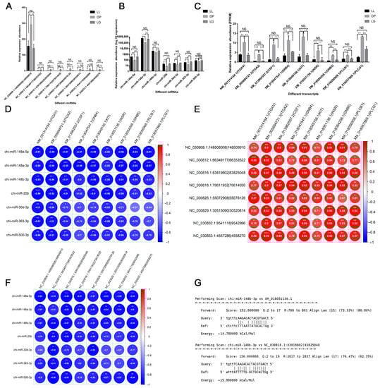 Analysis of expression patterns of circRNAs related to mammary gland development. (A) Analysis of circRNAs’ expression pattern related to mammary gland development; (B) Analysis of miRNAs’ expression pattern related to mammary gland development; (C) Analysis of mRNAs’ expression pattern related to mammary gland development; (D) Correlation between miRNAs’ and mRNAs’ expression; (E) Correlation between circRNAs’ and mRNAs’ expression level; (F) Correlation between miRNAs’ and circRNAs’ expression level; (G) Target relationship predicted by miRanda software. * indicates p < 0.05, ** indicates p < 0.01, *** indicates p < 0.001, and NS indicates not significant.